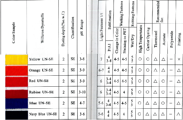 1、適合超細纖維織物的中深色染色,黃紅藍可作為驗色調三原色,橙、紅玉、深藍可作為暗色調三原色。